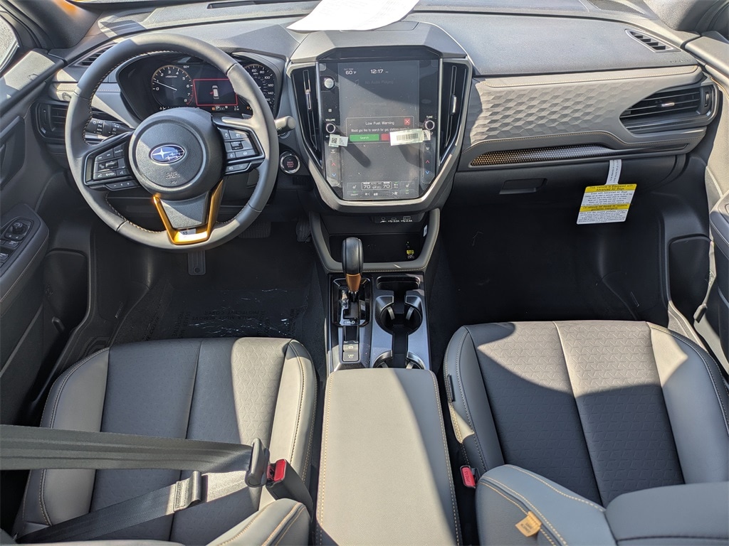 AWD 4-Wheel Disc Brakes, 6 Speakers, ABS brakes, Air Conditioning, Alloy wheels, AM/FM radio: SiriusXM with 360L, Anti-whiplash front head restraints, Auto High-beam Headlights, Auto-Dimming Exterior Mirror with Approach Light, Auto-Dimming Mirror with Compass and HomeLink, Automatic temperature control, Brake assist, Bumpers: body-color, Driver door bin, Driver vanity mirror, Dual front impact airbags, Dual front side impact airbags, Electronic Stability Control, Emergency communication system: MySubaru Companion (5-years free), Exterior Parking Camera Rear, Four wheel independent suspension, Front anti-roll bar, Front Bucket Seats, Front Center Armrest, Front dual zone A/C, Front fog lights, Front reading lights, Fully automatic headlights, Harman/Kardon Speaker System and Power Rear Gate, Heated door mirrors, Heated Front Bucket Seats, Heated front seats, Illuminated entry, Knee airbag, Low tire pressure warning, Occupant sensing airbag, Outside temperature display, Overhead airbag, Overhead console, Panic alarm, Passenger door bin, Passenger vanity mirror, Power door mirrors, Power driver seat, Power moonroof: Panoramic, Power Rear Gate, Power steering, Power windows, Radio data system, Radio: Subaru 11.6" Multimedia Navigation System, Radio: Subaru 11.6" Multimedia Plus System, Rain sensing wipers, Rear anti-roll bar, Rear Bumper Cover, Rear seat center armrest, Rear Seatback Protector, Rear window defroster, Rear window wiper, Remote keyless entry, Security system, Speed control, Speed-sensing steering, Split folding rear seat, Spoiler, Steering wheel mounted audio controls, Tachometer, Telescoping steering wheel, Textured StarTex Upholstery, Tilt steering wheel, Traction control, Trip computer, Turn signal indicator mirrors, Variably intermittent wipers, Wheels: 17" x 7.0 J Matte Black Finish Aluminum-Alloy, Wilderness Plus Package. 2026 Subaru Forester Wilderness
