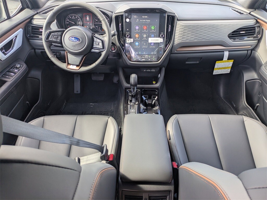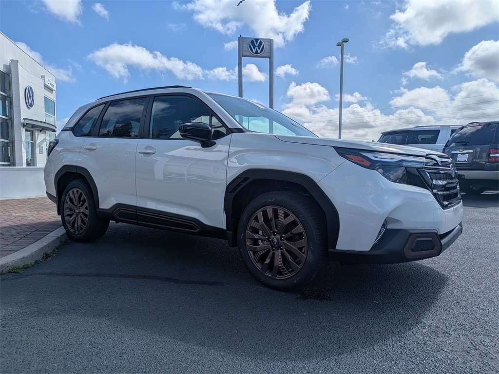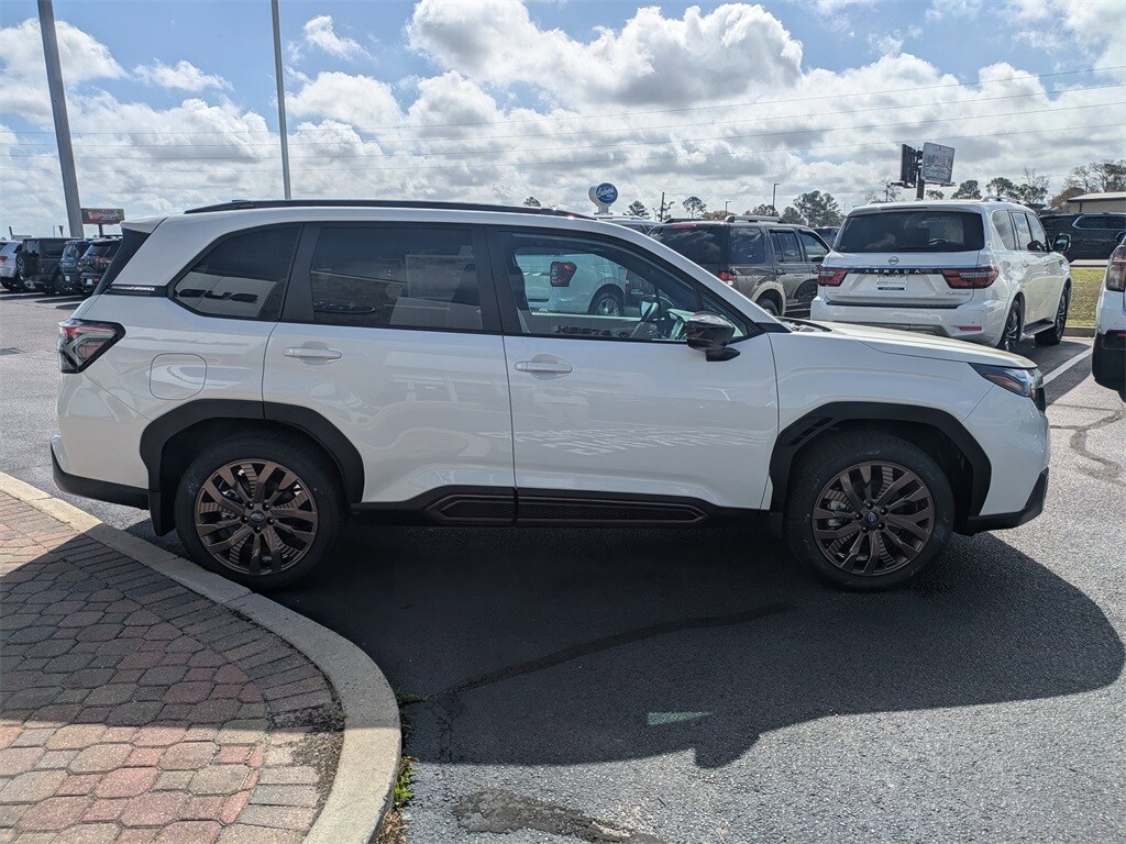 AWD 4-Wheel Disc Brakes, 6 Speakers, ABS brakes, Air Conditioning, All-Weather Floor Liners, Alloy wheels, AM/FM radio: SiriusXM with 360L, Anti-whiplash front head restraints, Auto High-beam Headlights, Auto-Dimming Mirror with Compass and HomeLink, Automatic temperature control, Brake assist, Bumpers: body-color, Cargo Net, Driver door bin, Driver vanity mirror, Dual front impact airbags, Dual front side impact airbags, Electronic Stability Control, Emergency communication system: MySubaru Companion (5-years free), Exterior Parking Camera Rear, Four wheel independent suspension, Front anti-roll bar, Front Bucket Seats, Front Center Armrest, Front dual zone A/C, Front fog lights, Front reading lights, Fully automatic headlights, Harman/Kardon Speaker System, Harman/Kardon Speaker System and Power Rear Gate and Reverse Automatic Braking, Heated door mirrors, Heated Front Bucket Seats, Heated front seats, Illuminated entry, Knee airbag, Leather steering wheel, Low tire pressure warning, Occupant sensing airbag, Outside temperature display, Overhead airbag, Overhead console, Panic alarm, Passenger door bin, Passenger vanity mirror, Power door mirrors, Power driver seat, Power moonroof: Panoramic, Power Rear Gate, Power steering, Power windows, Radio data system, Radio: Subaru 11.6" Multimedia Plus System, Rear anti-roll bar, Rear Bumper Cover, Rear seat center armrest, Rear window defroster, Rear window wiper, Remote keyless entry, Reverse Automatic Braking (RAB) System, Security system, SI-Drive Dual-Mode Engine Performance Management, Speed control, Speed-sensing steering, Splash Guards, Split folding rear seat, Spoiler, Sport Plus Package, Sport StarTex Upholstery, Steering wheel mounted audio controls, Tachometer, Telescoping steering wheel, Tilt steering wheel, Traction control, Trip computer, Turn signal indicator mirrors, Variably intermittent wipers, Wheels: 19" x 7.5 J Bronze Finish Aluminum-Alloy. 2026 Subaru Forester Sport